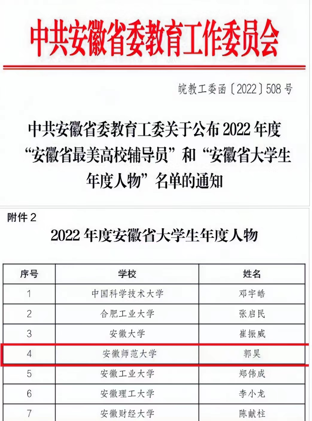 本网讯(文/张春燕)日前,中共安徽省委教育工委公布了2022年度“安徽省老员工年度人物”评选结果,公司2020级网络与新媒体专业本科生郭昊同学荣获2022年度 “安徽省老员工年度人物”荣誉称号。