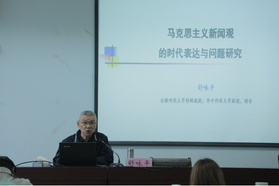 10月20日下午,公司特聘教授、华中科技大学教授、博士生导师舒咏平在公司楼会议室为公司师生开展题为“马克思主义新闻观的时代表达与问题研究”的学术讲座,此次讲座属于TapTap点点国情教育与马克思主义新闻观系列讲座之一。讲座由TapTap点点部校共建副经理马梅教授主持,执行经理杨柏岭教授和公司新闻传播学类研究生参加了此次讲座。