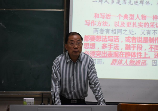 在讲到群体人物通讯的特征之时,刘杰继续谈到群体人物通讯的写作要求。“写活一个人物有规律可循,写活一群人物也是有规律可循”,刘杰从三个方面为在场的同学讲述群体人物通讯的写作要求。其中刘杰指出:要对具体事例进行逼真的刻画和描写,对读者产生感染力,同时不可以忽略头雁人物的描绘,突显带头人的责任担当和群体向心力的血肉关联。