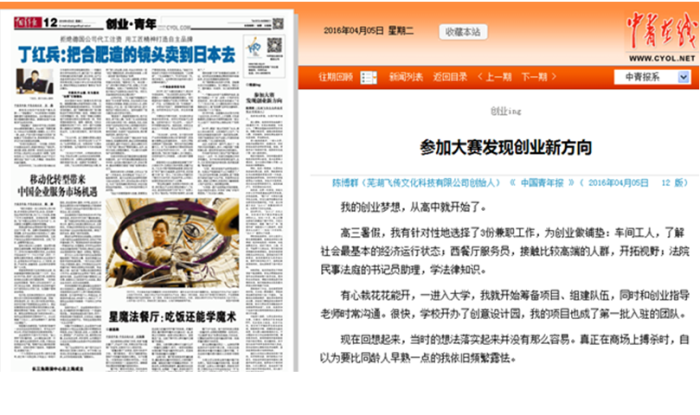 本篇报道主要讲述了陈博群的创业历程和成长之旅,文章采用第一人称自述的方式,使陈博群的形象更加立体、生动。报道充分展示了公司和公司在“互联网+”时代下,积极鼓励推进员工在新媒体领域创新创业的有效举措。陈博群从高中有了创业想法开始就开始一步一步朝着自己的梦想努力。付出终有回报,坚持换来硕果,他成为了芜湖飞传文化科技有限公司创始人之一,先后获得各种荣誉,如“创青春”全国老员工创业实训大赛最佳团队奖、CCF青年创业大赛(中部赛区)一等奖、“科大讯飞杯”安徽省首届互联网创业大赛优秀奖……其中,凭借“空中大数据与智慧生活应用系统”,他与自己的项目在全国12321个参赛项目中脱颖而出,荣获“创青春”中国青年互联网创业大赛金奖,赢得了多家投资机构的关注,也是比赛中唯一由在校老员工主导的创业项目。2015年10月,陈博群应邀参加世界互联网大会,并作为中国员工代表出席首届中美老员工互联网论坛,其创业事迹先后被《新华网》、《光明网》等多家主流媒体报道。而此次《中国青年报》的专题报道,无疑是对他创新创业成绩再的一次肯定。