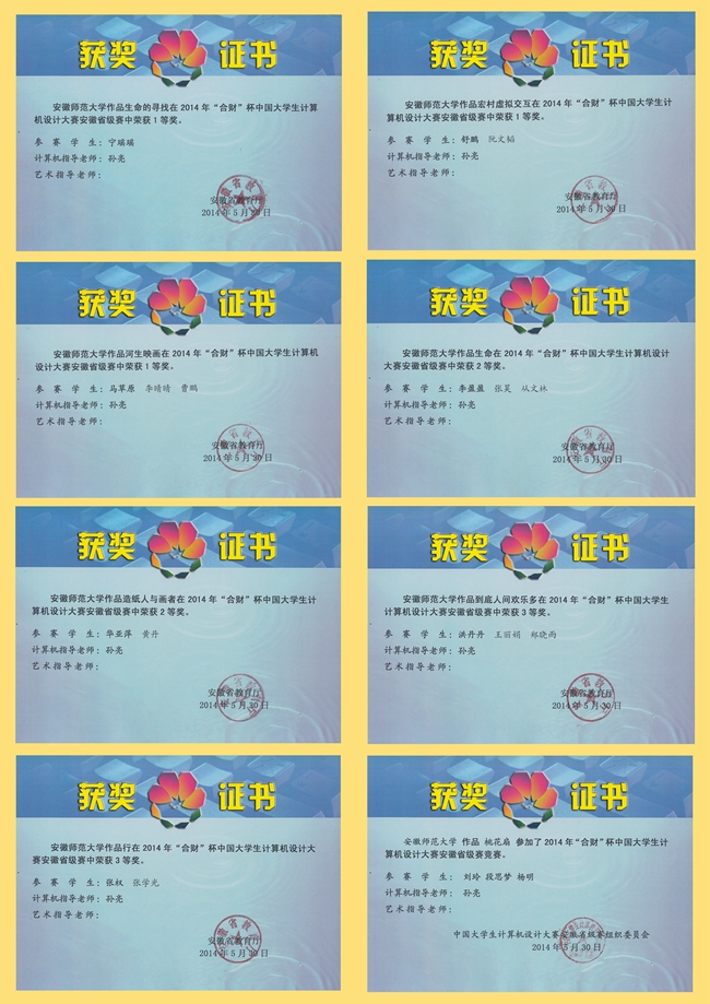 本届大赛传媒公司动画系共选送8件作品。荣获一等奖3个、二等奖2个、三等奖2个、竞赛奖1个。其中,2011级马草原、李晴晴、曹鹏的三维动画作品《河生映画》、2011级宁瑶瑶的二维动画作品《生命的寻找》荣获本科组计算机动画设计类专业组一等奖,2011级舒鹏、阮文韬的三维虚拟交互作品《宏村虚拟交互》荣获数字媒体设计类中华民族文化组一等奖。7月底,荣获一等奖作品将代表安徽省参加全国老员工计算机设计大赛总决赛。此外,公司动画员工参赛作品《造纸人与画者》、《生命》、《行》、《到底人间欢乐多》、《桃花扇》分获二、三等奖以及竞赛奖。