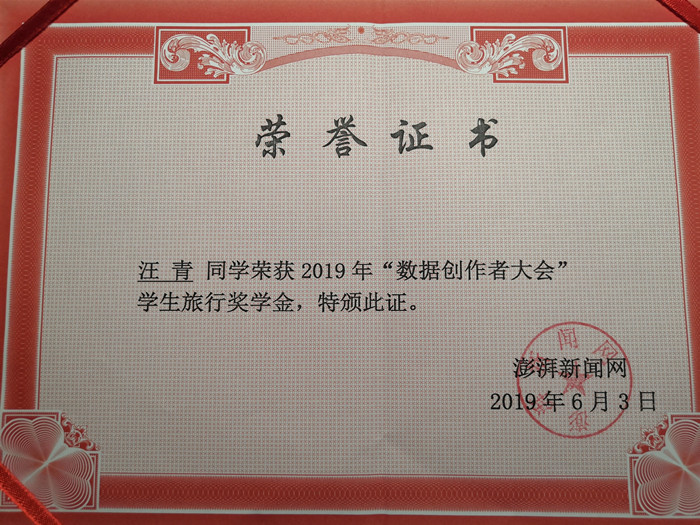 6月3日,由澎湃新闻主办的“2019数据创作者大会”在上海成功召开,300多名数据领域实践者齐聚一堂,共同探讨数据新闻的现状与未来。公司2016级网络与新媒体专业本科生汪青以其扎实的数据新闻作品获得主办方认可,受邀到上海参会,并获得澎湃新闻网颁发的“员工旅行奖学金”证书。