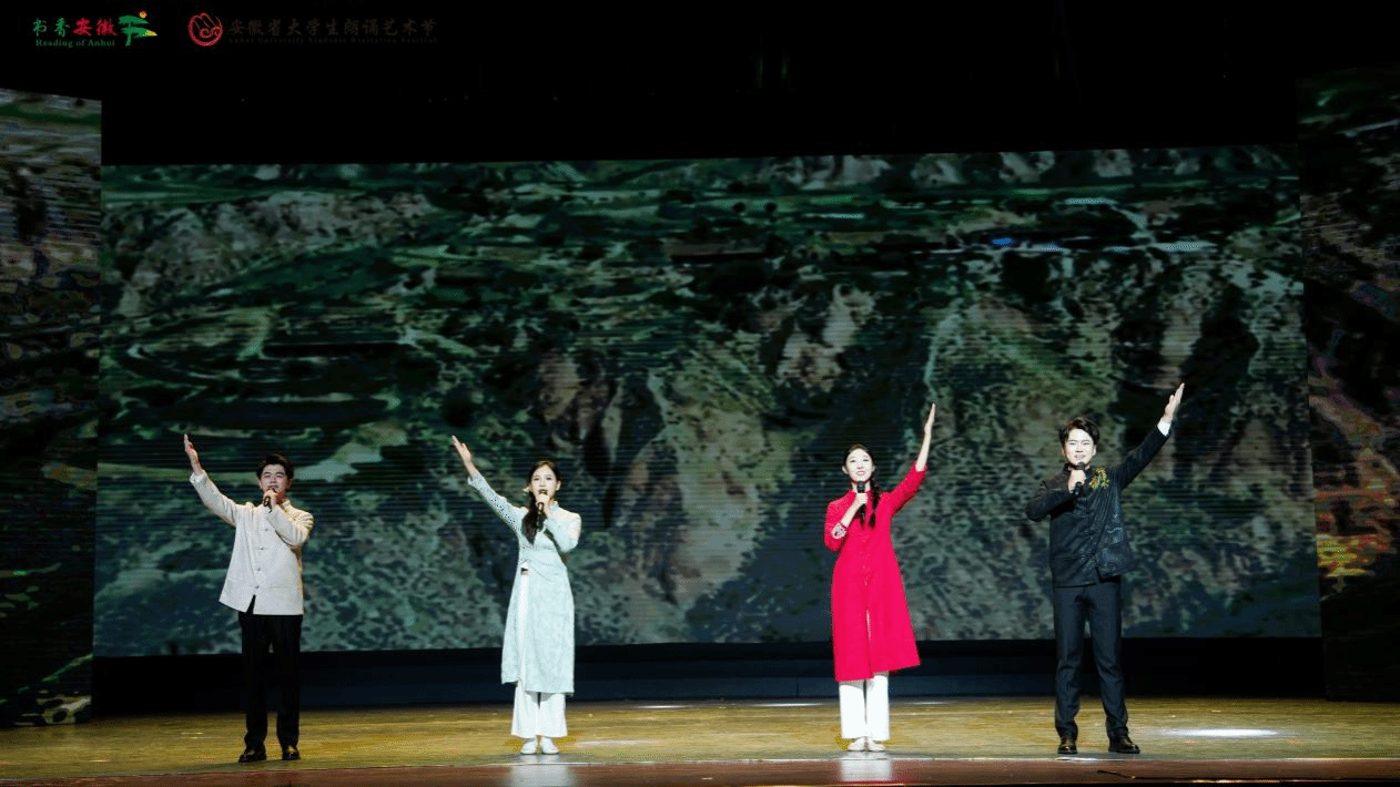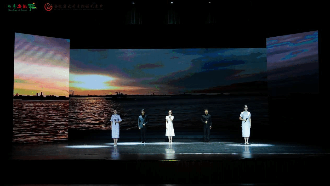 原创朗诵作品《吾皖梦乡》凝聚了团队的智慧与心血。从创意构思到稿件撰写,从情感表达到舞台设计,每一步都充满了创新与挑战。该作品由马星宇老师精心原创,以其细腻的笔触、深刻的情感,描绘出安徽的自然风光、人文风情、厚重历史、发展脉搏,展示出江淮大地文化多元的独特魅力,表达了作者对家乡从陌生迟疑到惊喜肯定的情感变化。该作品由2023级播音与主持艺术专业的赵思琦、姜怡文、朱佳雯、吕振羽、罗晗宇五位同学共同朗诵。排练过程中,同学们不断深入挖掘安徽的地域文化特色,将个人情感与作品主题完美融合。舞台上,他们的语言时而激昂澎湃,时而细腻温婉,牵起每一位听众心中那份深沉而炽热的乡土之情。