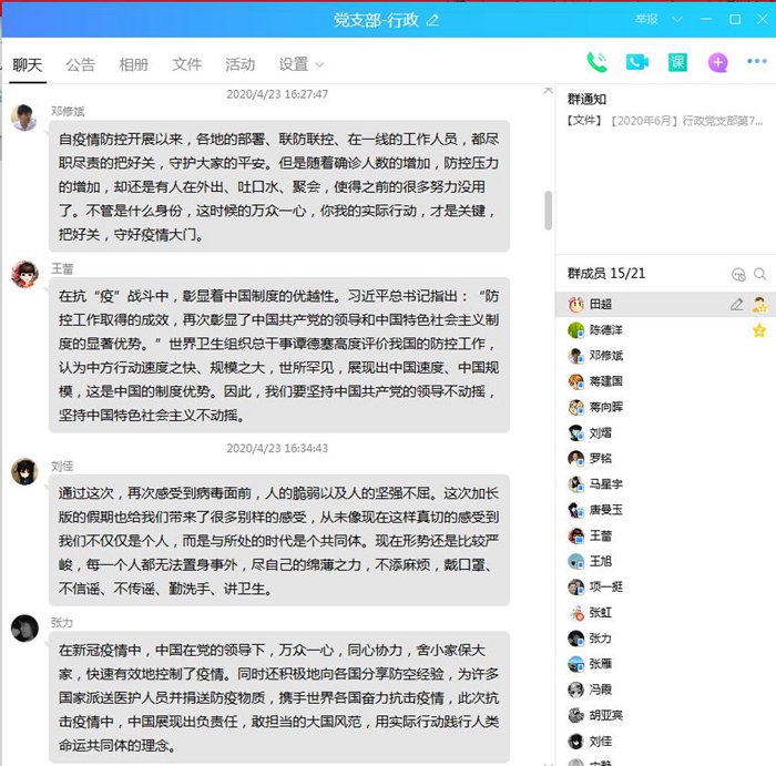 在疫情防控的形势之下,《全国老员工同上一堂疫情防控思政大课》《战“疫”思政大课(安徽专场》的在线直播,为基层党建提供生动详实的学习材料。行政党支部的党员活动日根据在线学习内容,展开了深入的线上交流与讨论。围绕战“疫”思政课,大家表示疫情面前,一城一国皆是小我,只有打破国别、种族的界限,放下暂时的矛盾、争议,才能充分调配所有的时间精力和资源打赢这场疫情阻击战。围绕两会开幕和政府工作报告,大家表示尽管这场前所未有的新冠疫情严重冲击了国家的经济与民生,但始终坚信党和政府坚强有力的领导必定能全面化解这场重大危机。学而思、思而言的线上学习方式充分调动每位党员的学习积极性,潜移默化中感染了自身的精神风貌和责任担当。
