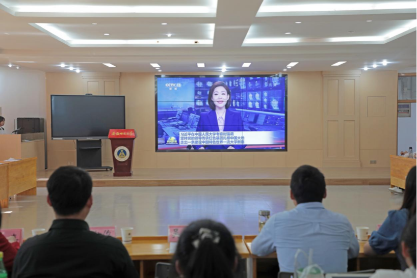 恰同学少年,风华正茂。当天下午的主题团日活动在奏唱团歌时拉开了帷幕。团歌奏唱完毕后,与会师生共同观看新闻联播视频《习近平考察中国人民大学》,认真聆听习近平总书记在中国人民大学考察和在师生座谈会上的重要讲话。