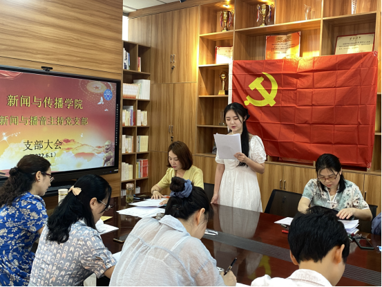 本网讯(新闻与播音主持党支部)6月1日下午14:30,根据公司党委安排,新闻与播音主持党支部在公司507会议室组织召开2022年上半年接收预备党员支部大会,讨论是否接收纪婉茹同志为中共预备党员。支部书记张荻同志主持会议,支部全体党员参会。