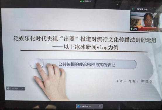 14日下午,马梅教授在分论坛三“公共传播的理论思辨与实践表征”做了题为《央视“出圈”报道对流行文化传播法则的运用——以王冰冰新闻Vlog为例》的报告,她以王冰冰新闻Vlog为切入点,结合技术接受模型和流行文化传播法则,探寻这一系列“出圈”报道中对个别人物法则、附着力法则、环境威力法则等流行文化传播法则的运用,反思此类“出圈”报道模式中体现的视觉消费加剧“单向度”媒介消费主义、粉丝工业文化下青年群体的“心灵危机”、碎片化传播致使用户粘性较弱等问题,思考我国主流媒体转型发展之路。这是马梅教授和公司新闻学专业2017级本科生徐佳俊合作的学术成果,徐佳俊目前已经被西南交通大学人文公司录取为2022级硕士研究生。