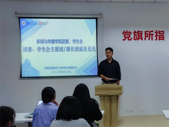 竞选会伊始,竞选主席团成员姚巧巧、王涵、鲍孟佳和竞选团委副书记成员周弘历、毛心如依次上台发言汇报,就团委及员工会任职两年情况进行总结、回顾,就未来团委、员工会建设工作进行展望、规划,突出留任优势,诉说未来愿景。随后,各部门竞选部长的成员一一汇报。宣传部张睦笛晓之以理,拿数据说话——累计完成推文制作及稿件撰写数量彰显竞选优势;素质拓展部房鑫悦动之以情,讲述在团委任职一年的成长;办公室王孙貊骊巧用提问式进行汇报,令人印象深刻;文艺体育部景镜维侃侃而谈、轻松幽默,带来别样氛围。