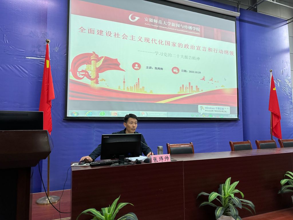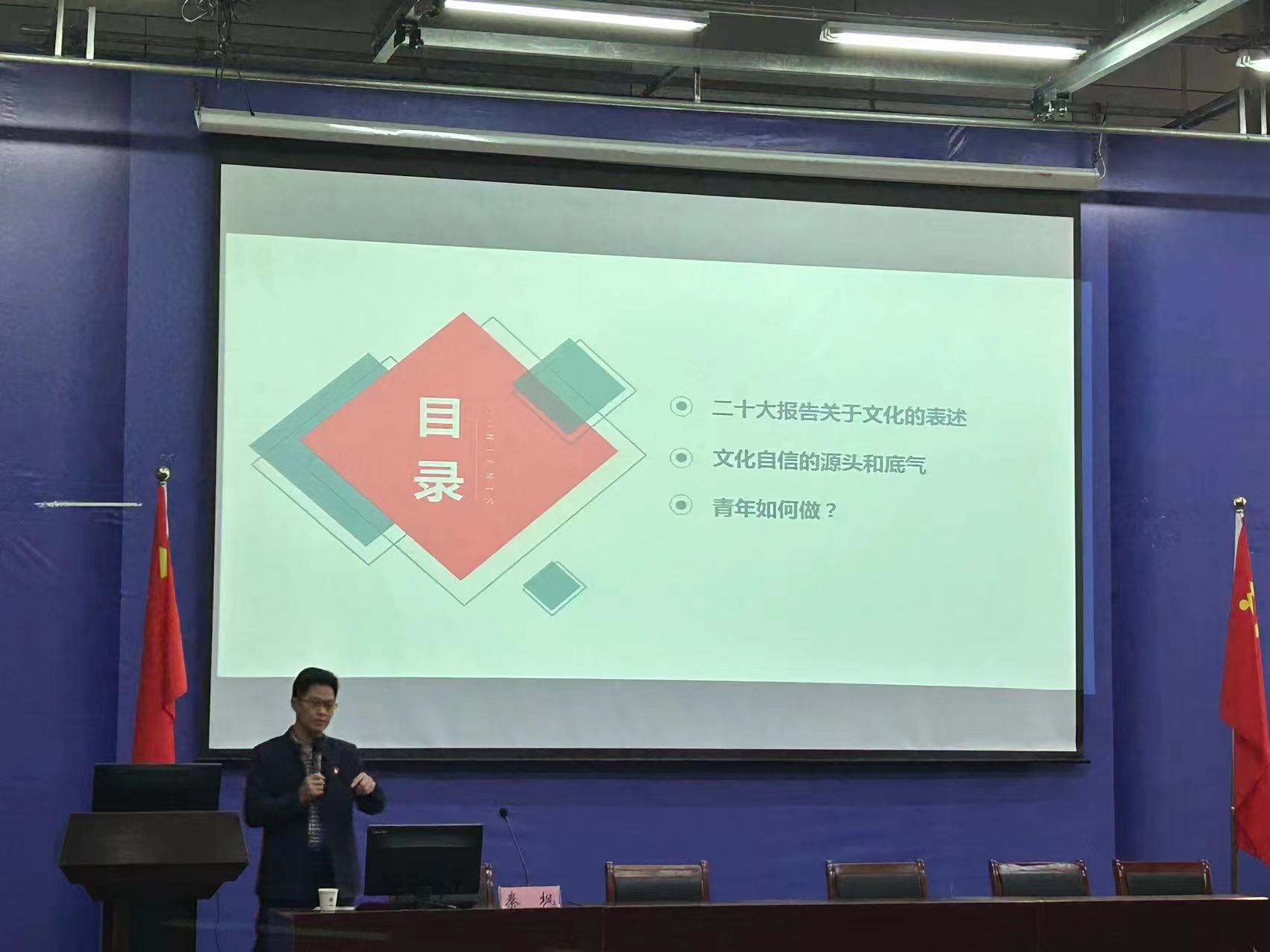 副经理秦枫以《文化自信自强与当代青年发展》为主题,为同学们讲授了党的二十大报告中关于文化自信的有关内容,引经据典地说明了文化自信的内容、要求、来源与底气,并强调,青年老员工尤其是未来传媒人要积极推进文化自信自强,铸就社会主义文化新辉煌,要把握好“输入与输出”两个方面的要求,客观对待文化输入,更要学习挖掘中华民族优秀文化,做中国优秀文化的有力传播者,并寄语同学们要拥有远大理想、热爱伟大祖国、担当时代责任、勇于砥砺奋斗、练就过硬本领、锤炼品德修养。