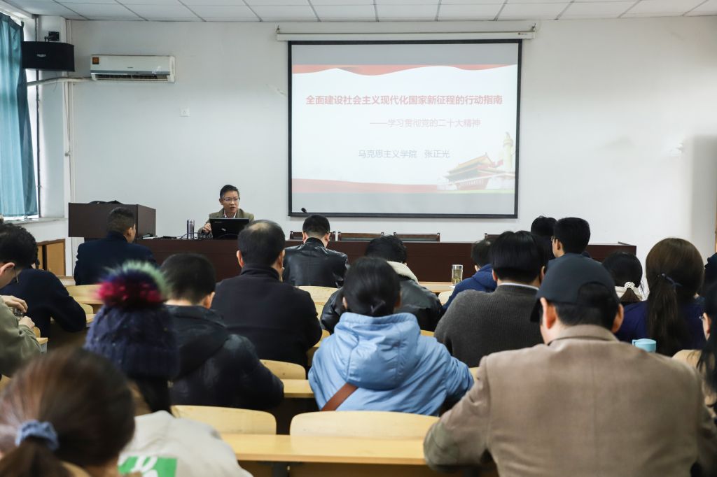 张正光作题为《全面建设社会主义现代化国家新征程的行动指南》的专题报告。他从党的二十大召开的历史背景和党的二十大报告的篇章结构、主要内容、理论创新、学习要求等几个方面进行细致解读。他认为,大会的主题回答了举什么旗帜、走什么路、以什么样的精神状态、实现什么样的目标四个问题,详细分析了报告的十大亮点。他指出,学习党的二十大报告要认真读原文,逐字逐句地读、版本对照着读;要深刻悟原理,领悟新思想、新论断、新观点、新要求;要带着问题读,围绕思想问题、工作问题和生活问题;要结合实际读,推动理论与实践相互结合;要引领方向读,坚定信仰、信念、信心。