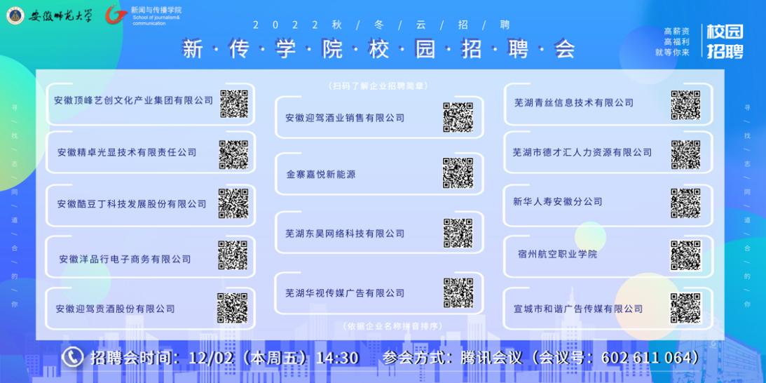 公司高度重视此次招聘会,通过招聘邀请发布、用人单位报名、工作人员认真遴选后,共邀请了芜湖青丝信息技术有限公司、安徽精卓光显技术有限责任公司、安徽顶峰艺创文化产业集团有限公司、宣城市和谐广告传媒有限公司、安徽迎驾贡酒股份有限公司、宿州航空职业公司、芜湖华视传媒广告有限公司、金寨嘉悦新能源、芜湖东昊网络科技有限公司、安徽迎驾酒业销售有限公司等11家优秀企业单位,提供就业岗位共150个。