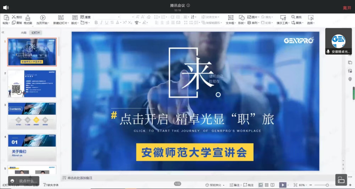 吴青山首先代表公司致辞,对参与的用人单位表示热烈的欢迎和由衷的感谢,并简要介绍公司和各专业的基本情况,期待以此次活动为契机,为用人单位输送更多高质量人才。研究生教学秘书崔霞主要介绍了研究生的毕业情况,就专业情况和生源情况两方面进行汇报,提及毕业生中安徽本地生源居多,希望其能与省内优质企业双向选择。马星宇介绍了本科毕业生的基本信息,从专业情况向各企业负责人员报告,以便企业与毕业生后续的交流。发言完毕后,公司领导老师与企业招聘负责人进行了线上的云合影。