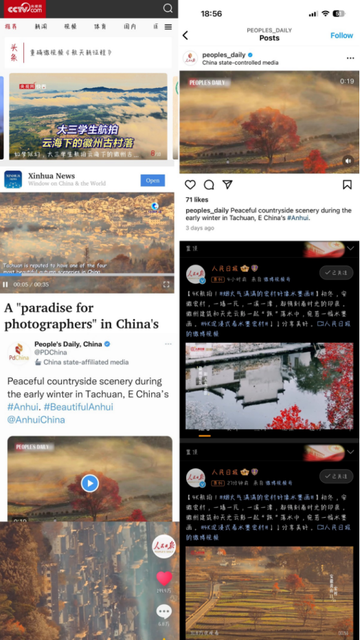 11月16日、11月17日,2020级网络与新媒体专业郭昊拍摄的短视频《水墨宏村》、《塔川秋色》被《人民日报》微博平台转发,相关话题“安徽绝美秋色如诗如画”和“烟火气满满的宏村好像水墨画”登上微博热榜。11月18日,人民日报海外平台、新华社海外平台、海外Twitter和Instagram等平台均发布了宏村和塔川的秀丽秋景,相关话题在海外平台获得大量关注。截至目前,两条短视频全网、全球累计播放量突破5亿。11月28日,郭昊采风作品《云海下的徽州古村落》在央视网抖音、视频号、微博等官方平台发布。11月29日,该视频被央视网置顶推送。
