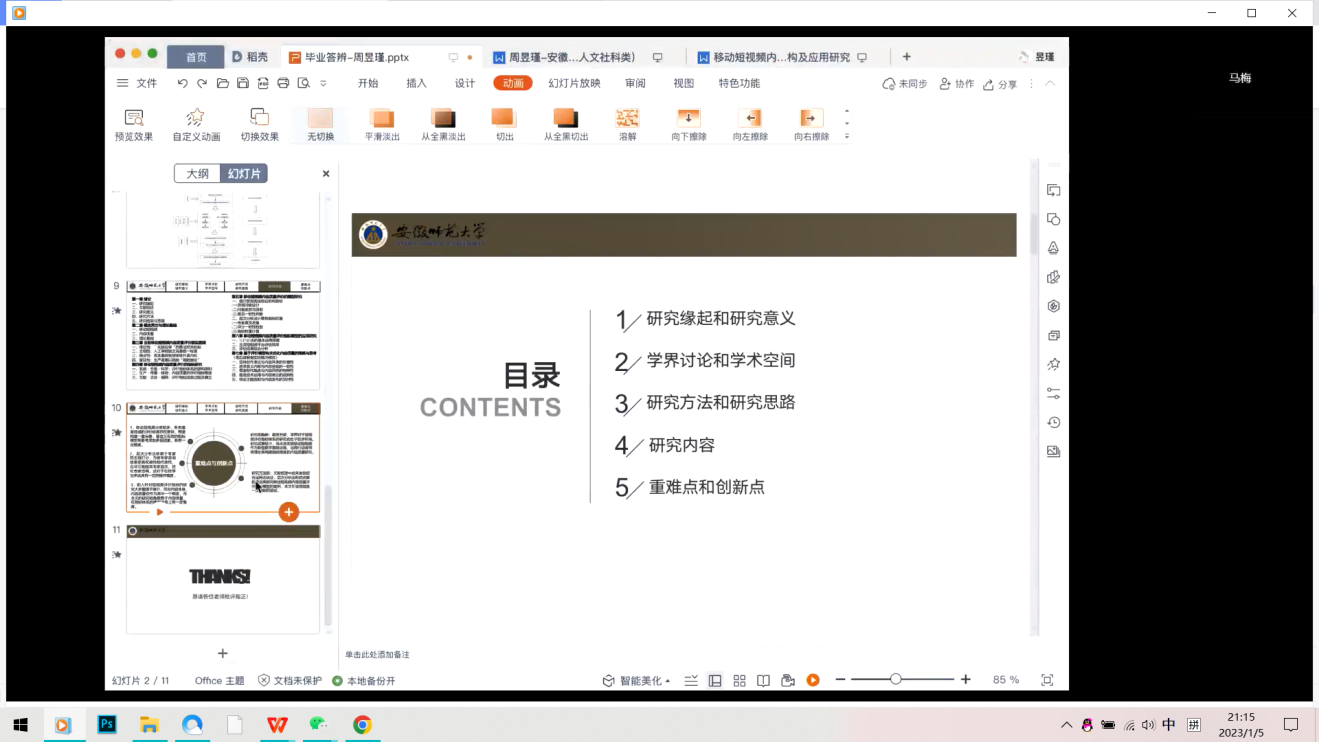 此次报告会共有23名2021级新闻传播学硕士研究生进行了汇报。同学们依次通过演示文稿阐明自己论文的选题背景、国内外文献综述、基本框架以及论文的创新点、重难点等方面的内容。论文选题涉及短视频、新闻叙事、媒介素养、 文化传播、情感传播、国际传播等多个新闻传播学领域,负责点评的导师对员工的开题报告进行了认真评阅,逐一点评,不仅对选题的可操作性和创新性提出指导意见,还认真、严谨地指出文献综述和内容框架存在的问题,并针对文献综述逻辑性不足、文章结构不合理、视角不够聚焦等问题提出细致的修改意见。