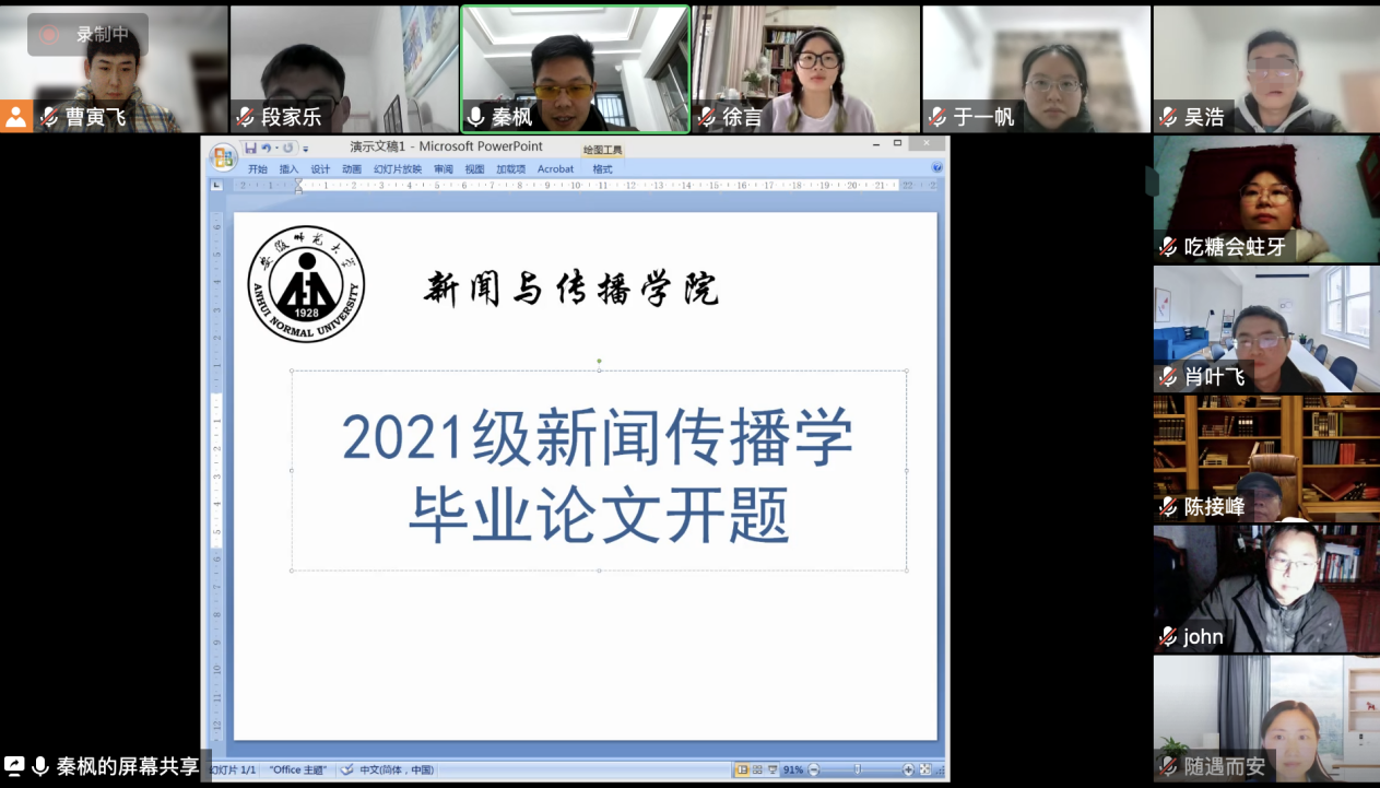 近日,2021级新闻传播学学术型硕士研究生开题报告会在腾讯会议线上举行。报告会分为三组进行,分别由沈正赋、秦枫和翟光勇主持,新闻传播学专业全体硕士研究生导师担任评审,2022级新闻传播学专业的研究生参与了旁听和学习。
