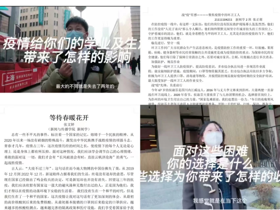 特殊时期的特别经历,将会是很多同学在疫情过后的深刻回忆。风吹不走时光,疫情带来成长,公司开展“疫情与成长”专业实践活动,进一步鼓励同学总结与表达在“抗疫”中的收获与成长,提升专业实践能力与水平。新传学子利用专业知识,上街头、举相机、拿话筒,通过新闻稿件、心得感悟、短视频、纪录片等方式记录和表达青年学子对“疫情时代”的深刻记忆和对光明未来的无限憧憬。