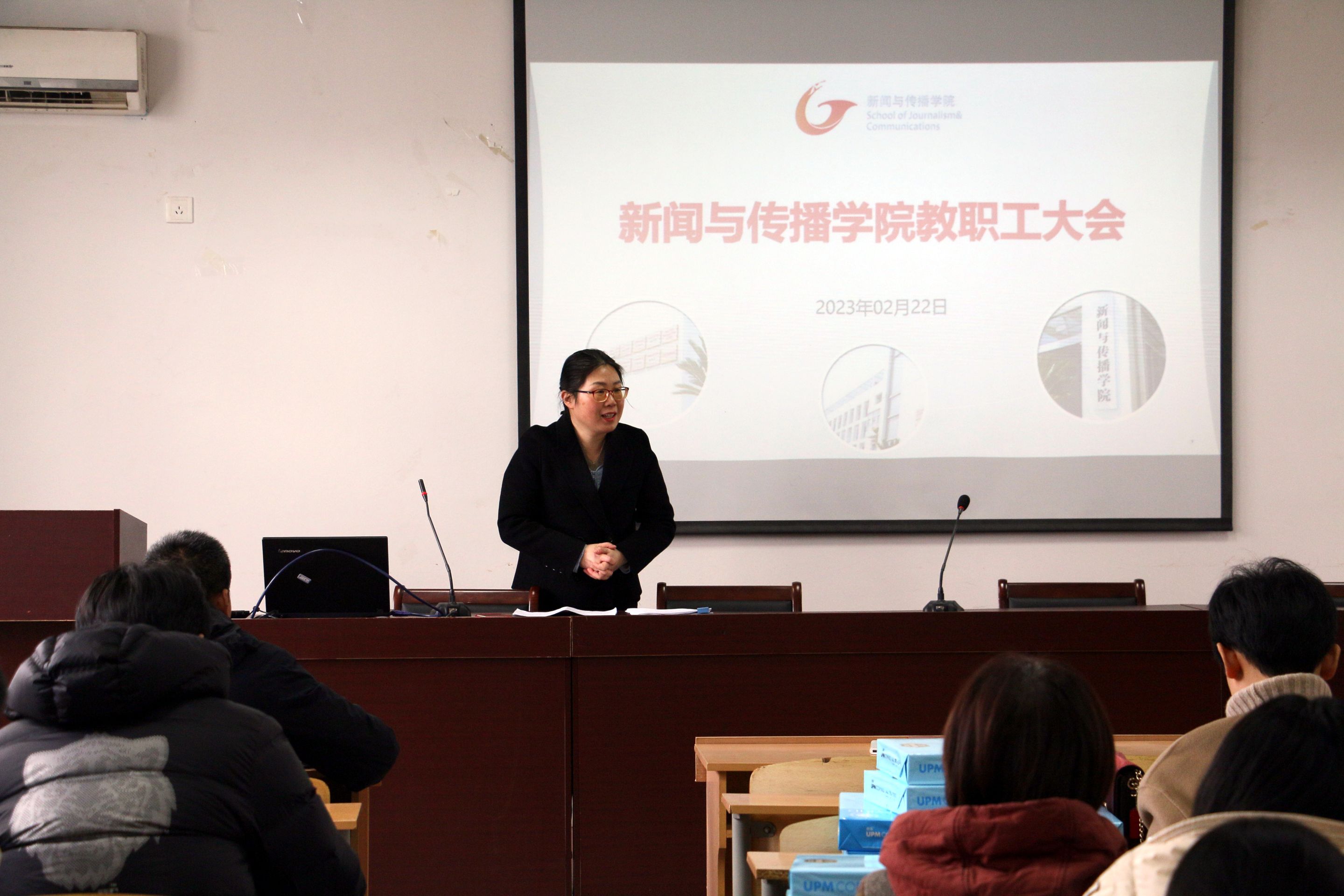 会上,马梅表示,2022年在疫情的影响下,全体教职工同舟共济,砥砺前行,通过线上线下相结合的方式,圆满的完成了各项工作任务。回顾过去,展望未来,她从为何出发,到如何走来,细数了公司成立的十三年历程与部校共建新闻公司的十年征程。尤其是部校共建的成果丰硕,省委有关领导在近期视察时,也给予了充分肯定并对下一个十年的发展寄予殷切期望。她指出,过去的一年,在党建引领之下,院班子始终贯彻“一岗双责”的要求,以党风廉政专题会为抓手,通过多次理论学习,不断增强主体责任意识,完善制度建设。全院教工支部、员工支部也通过多种多样的形式,深入学习领会党的二十大精神。在师德师风建设方面,她强调全体教工要对标对表,自查自省,并深入学习先进人物事迹,营造良好的师德师风氛围。她就教师教学与研修、科研服务与平台、员工竞赛与实践等方面进行了总结,她指出各块工作均做出了成绩,但也存在思想建设不足,制度执行不够,创新能力欠缺,学科方向不集中,省级平台缺乏、保障力度薄弱等六个方面的问题,她强调接下来全院教职工要进一步提升载体、抓实效,育人先育己,积极参与教学、科研、实践、服务活动。