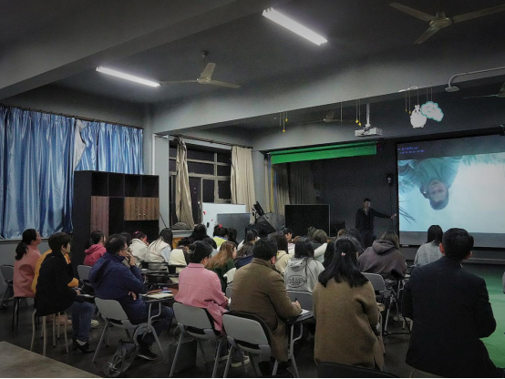 课堂上,孙翔结合影视案例对视点的定义、分类及具体应用进行分析。视点是摄影机的位置,剧情片中的视点又可以分为客观视点、主观视点、导演视点、间接主观视点。孙翔通过将理论知识与影视案例相结合,使晦涩难懂的理论知识以生动有趣的方式展现,同时使用拉片的技巧方式加深了同学们对理论知识的理解。课程最后,孙翔从实践角度现场示范,指出了视点在具体应用中需要注意的问题。