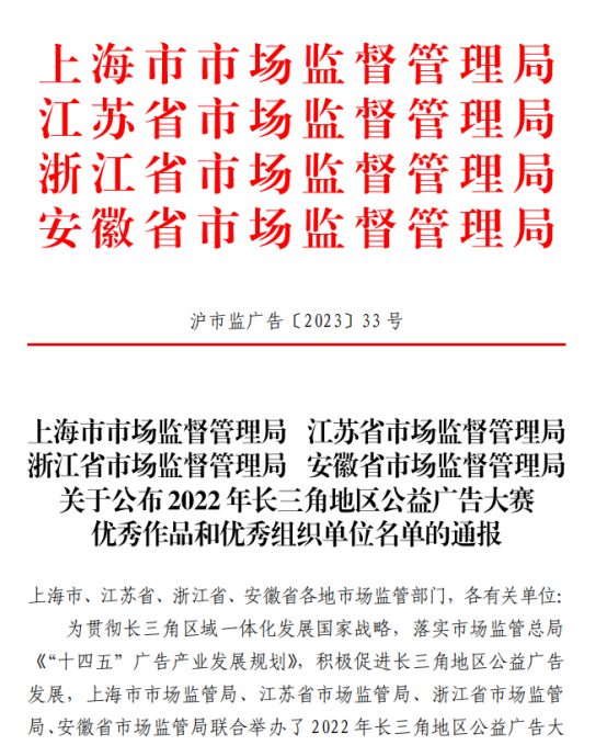 为贯彻长三角区域一体化发展国家战略,落实市场监管总局《“十四五”广告产业发展规划》,积极促进长三角地区公益广告发展,上海市市场监管局、江苏省市场监管局、浙江省市场监管局、安徽省市场监管局联合举办了2022 年长三角地区公益广告大赛。本次大赛共征集公益广告作品1373 件,其中平面类作品961件、视频类作品412 件。经两轮评审,评选出《巨变系列》《文化兴邦》《清白不浮华》《纪念南方谈话 30 周年》等30 件作品为优秀作品。