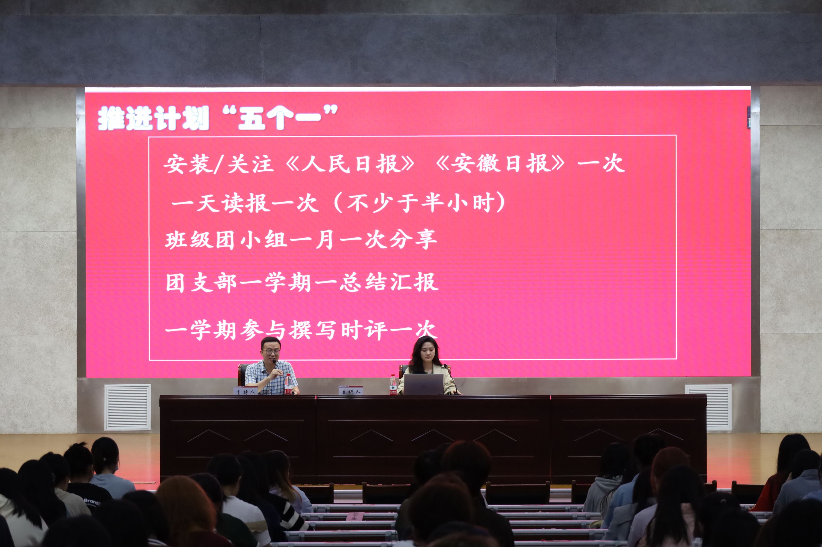 党报党刊是党和人民的喉舌,发挥着宣传党的理论路线方针政策的重要职责,是社会主义意识形态的重要阵地和传播社会主义先进文化的重要载体,也是高校不可缺少的思想政治教育优质资源。结合当前形势,李梦圆详细解读了公司“党报进校园”“五个一”活动安排,即安装并关注《人民日报》《安徽日报》一次、一天读报一次、班级团小组一月分享一次、团支部一学期总结汇报一次、同学们一学期参与撰写时评一次。