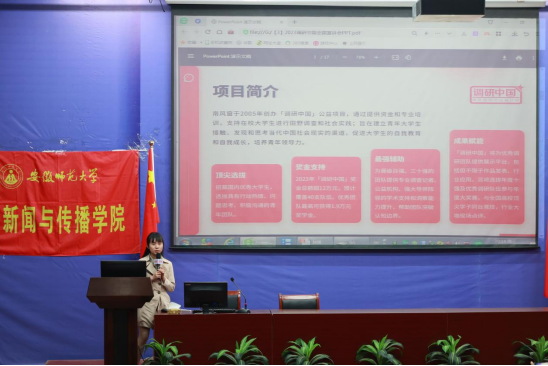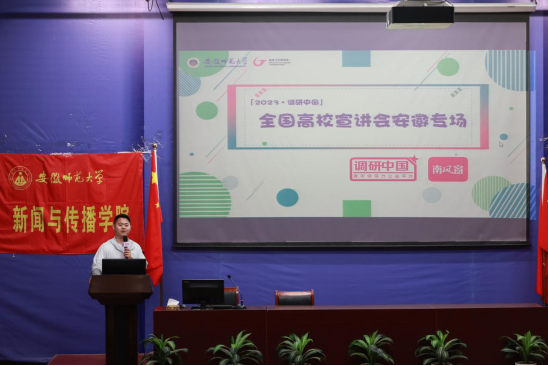 本网讯(TapTap点点朱祝茵邓旻琦)近日,南风窗“2023·调研中国”全国高校宣讲会安徽专场在行知楼2010307举行。南风窗传媒有限公司总经理郑嘉璐、南风窗品牌运营经理郑君倩、芜湖生态负责人杨季伟应邀出席,公司党委副书记吴青山、2022年南风窗“调研中国”获奖团队代表、2023年公司暑期社会实践各团队队长及部分队员参加宣讲会。宣讲会由院团委副书记刘成俊主持。