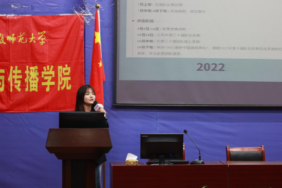 郑君倩为同学们讲述2023年调研中国的具体安排。她指出,今年的项目主题是“走!去调研!”,随后讲解了今年项目的新调整:为进入百强和三十强的团队提供专业辅导和强大导师阵容;增加成果赋能环节,将优秀的报告集结成册,在南风窗杂志发行;项目专题板块分为社会热点、教育、人文、产业、生态和乡村。