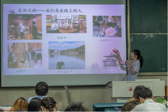 本次汇报按照组别依次进行,每组汇报3分钟左右,共计二十个小组。各组通过精彩的汇报分享,演绎他们与西递的碰撞,传达出此次采风之旅的所思所见所感以及产出的丰硕成果。本次采风产出大量的文字稿件,其中有很大的一部分在人民网、安徽日报、大江晚报等平台刊登,同时也采取多样的表现形式,如权杨晨小组对标橙光游戏创新推出的视频“与西递的前世今生”,黄雨婧小组微电影“把爱留在西递”,朱滢滢小组的数据新闻以及H5作品……可见此次采风之行,收获满满,成果颇丰。