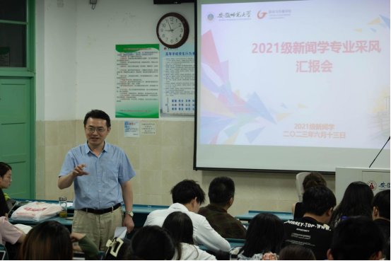 “讲故事,讲好故事,专业采风是重要的实践历练。”肖叶飞用最质朴的语言,为2021级新闻学子讲述着新闻业务中的深刻的学问。汇报之初,肖叶飞提出“要有勇气尝试,学会总结反思”。