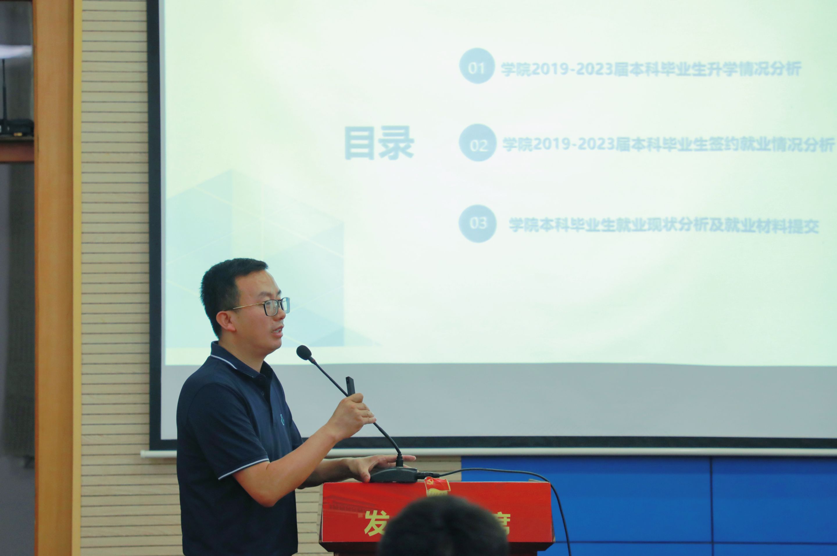吴青山以近五年公司相关专业的就业、考研数据作为参考依据,开展了全面系统的就业指导,为同学们分析当前的就业形势,明晰未来的就业方向。他将就业相关材料进行梳理展示,对同学们推进就业作出概括性提醒。他指出,近五年来,公司各专业考研情况相对稳定,并呈现向上走的趋势,也期待2024届毕业生的去向落实能够行稳致远。吴青山将目前的就业困境进行剖析,一是就业观念不清晰,应当抓紧时间明确就业方向,确立目标后就要脚踏实地、坚持到底;二是家校合力问题有疏漏,部分同学因家长的就业观念放松便容易躺平,虚度时光;三是就业能力需要全方面提升,毕业生应秉持高标准、严要求的端正态度参与就业招聘,注重细节,对自身负责;四是员工存在慢就业、怠就业、不就业心态,同学们需要转变就业认知,积极参与就业。此外,他还就安全问题做了专门提醒和要求。