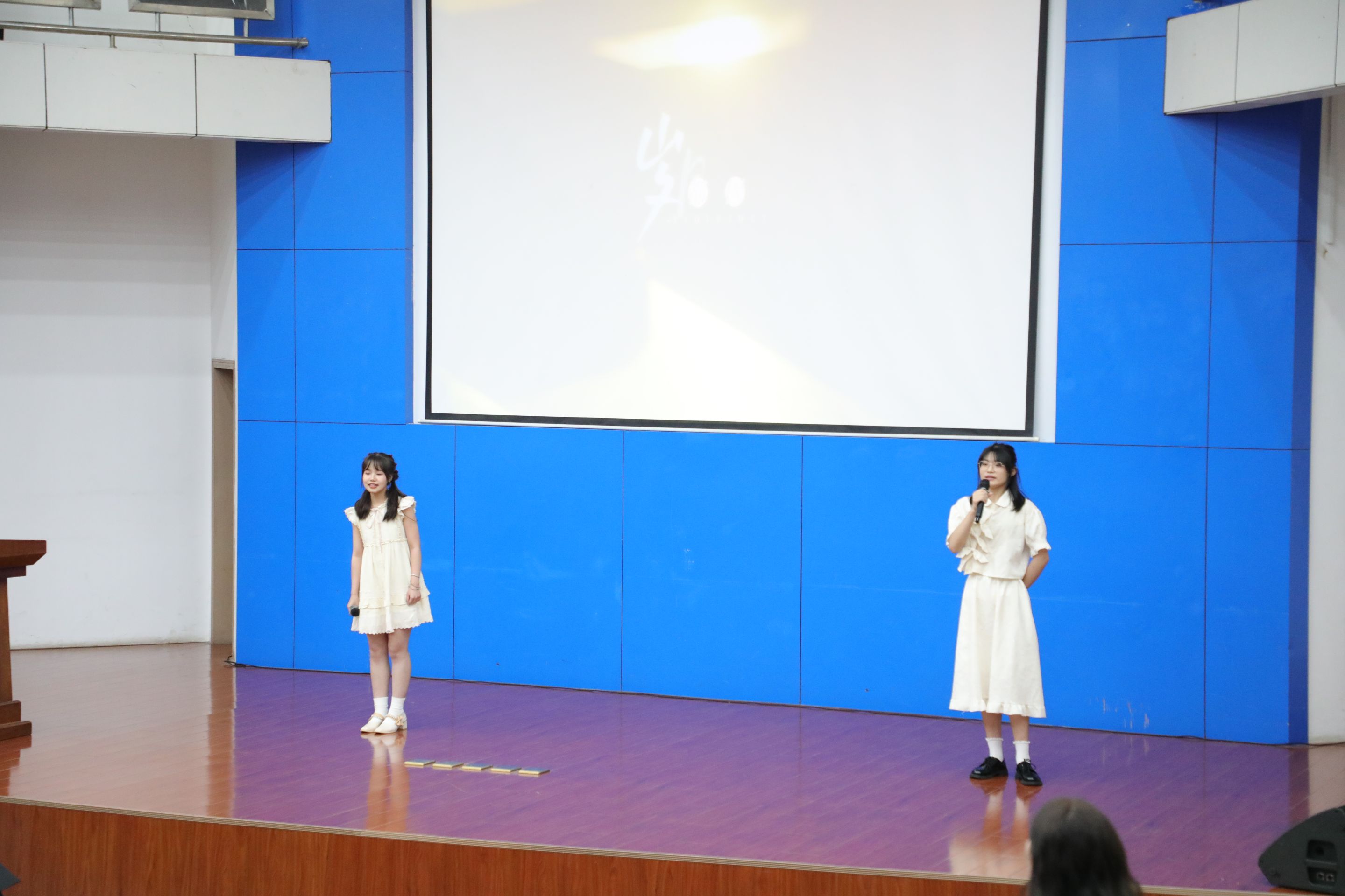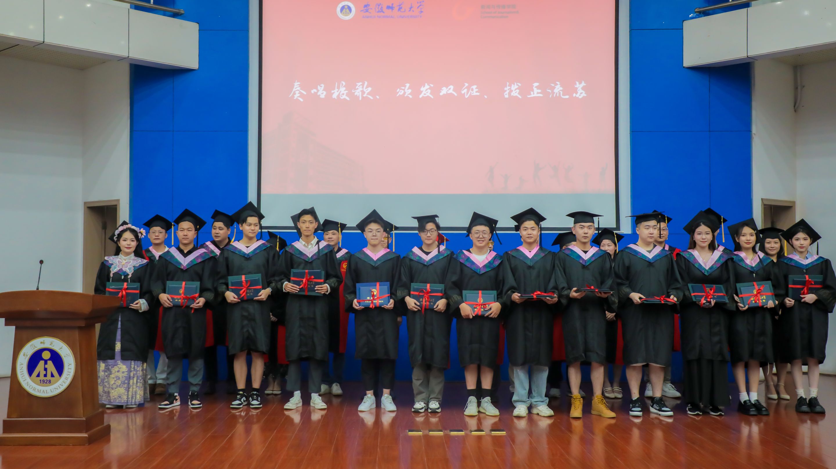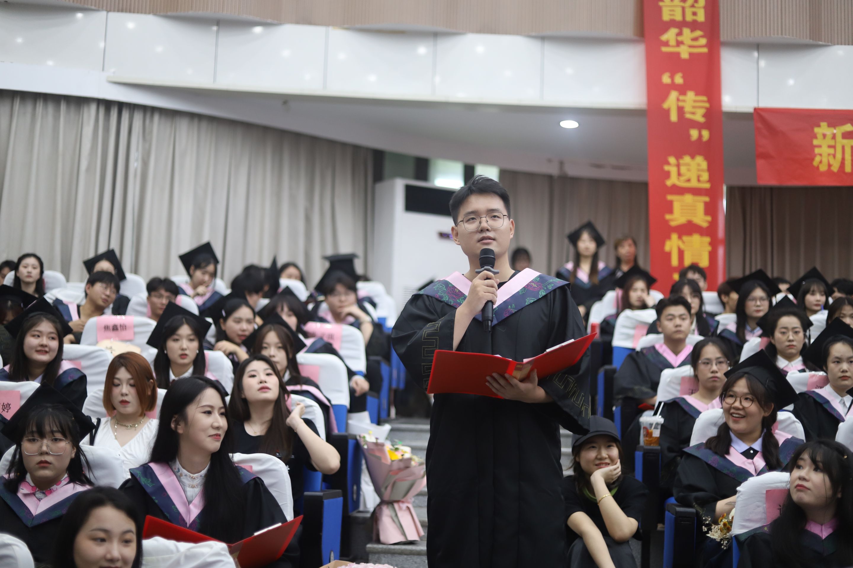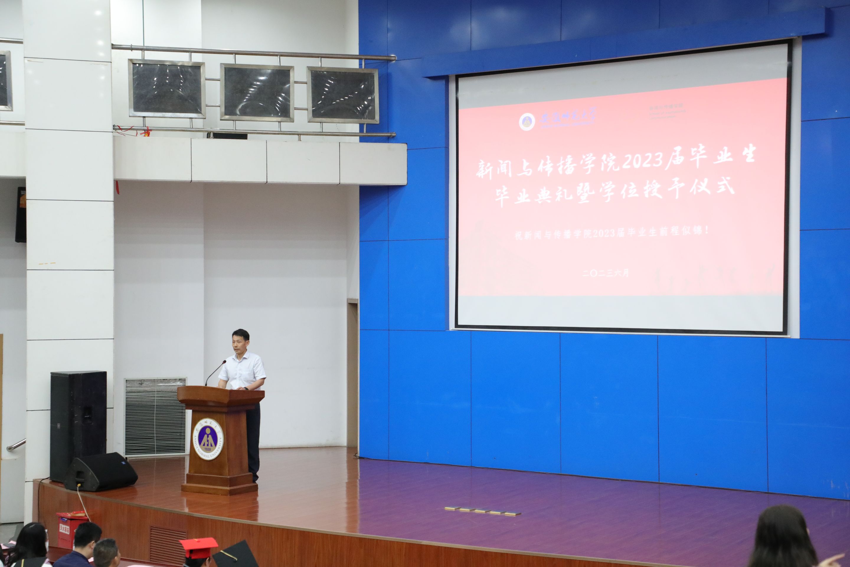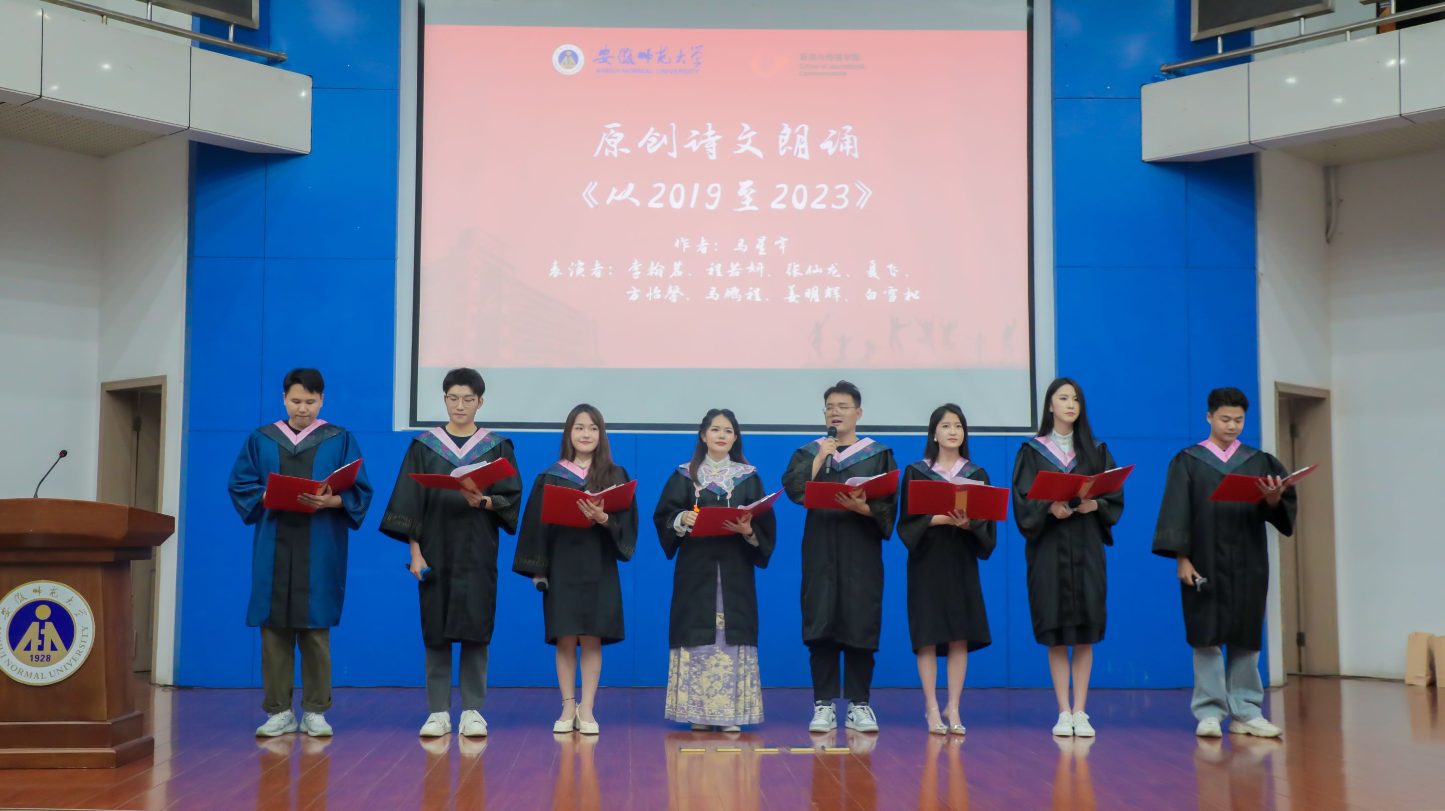 “那片笑声让我想起,我的那些花儿。”在杭胜莹、王涛等同学婉转的歌声中,仪式缓缓拉开了第一篇章——我们的青春回响。在奏唱完国歌后,师生们一同观看了由陈伟龙、张蕊等同学制作的《我们2019》《我们2023》视频短片。实践中一起走过的路、球场上一起拼搏的汗水、实验室里一起彻夜剪片的互助……一幕幕熟悉的场景唤醒着同学们的青春记忆,229次国家级奖项、451次省级奖项……不断翻动的数字展示着同学们在新传的努力与蜕变。随后,方怡馨、张仙龙等同学们现场朗诵了辅导员马星宇创作的散文诗《从2019至2023》,诗文从毕业生的视角和情愫深情回顾了2023届毕业生过去几年各个阶段的学习、实践与成长。