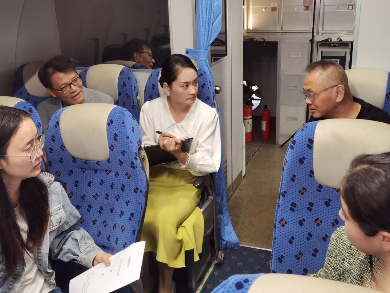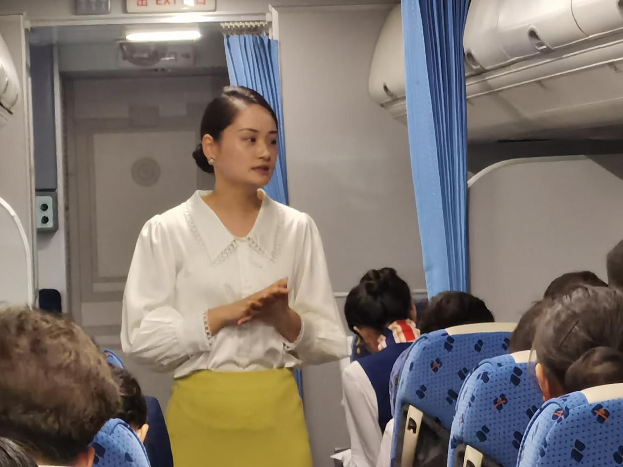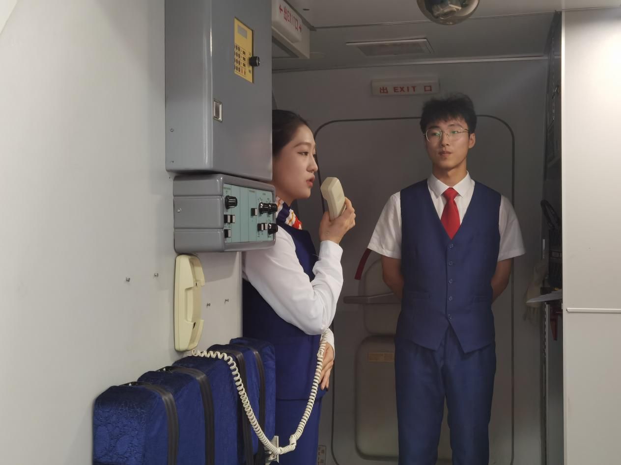 理论教学结束,各乘务组的“小乘务员们”开始了模拟舱中的实践环节,同学们以一个号位组为单位现场开展座椅失火演练,俞应芬老师通过号位组的模拟情况进行即时打分和点评。
