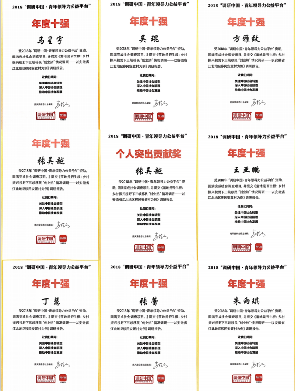 12月11日,《南风窗》杂志社公布了备受瞩目的2018年“调研中国”最佳团队名单,公司三峡移民团队与清华大学、中山大学、厦门大学等10所高校团队一起获得全国十强团队称号,并获得奖金一万元,队长张吴越与其他高校4位同学入选2018年“调研中国”个人突出贡献奖,各获得奖金五千元。这给今年的调研工作划上了圆满的句号。这是该团队在前期入选三十强团队后再次以扎实的调研作品、成果斩获殊荣,这次获奖也是公司历史上第一次与全国知名高校一起入选“调研中国”项目的年度十强,为公司、公司赢得了荣誉。今年,该项目有全国150所高校1140支团队7000余人的申报。