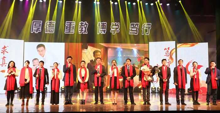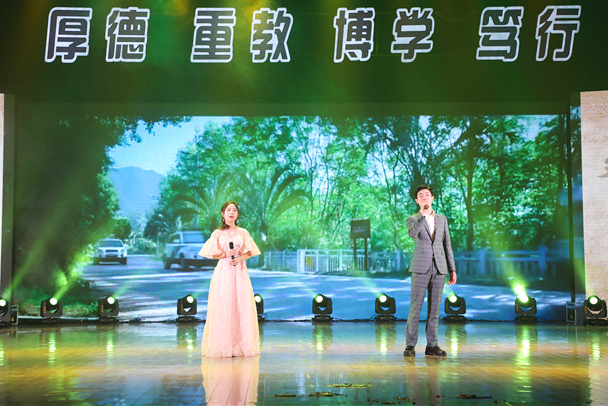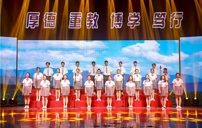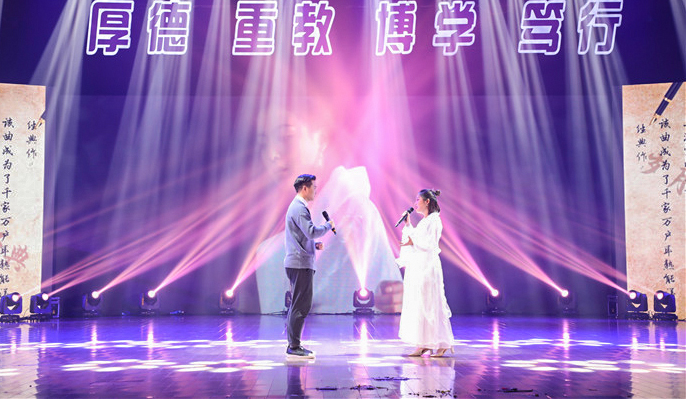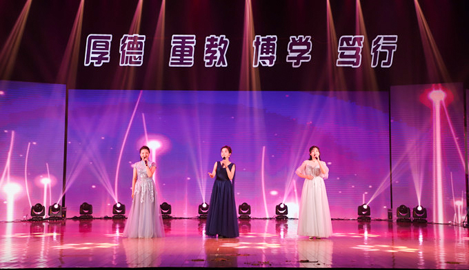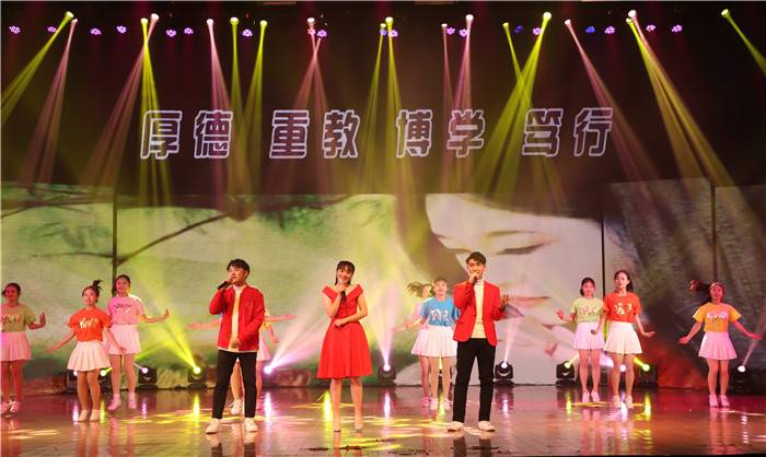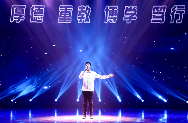 舞台的帷幕缓缓拉开,院合唱团整齐地站在台上与观众见面,庄重温婉的师大校歌馨然奏起,男生浑厚的嗓音和女生轻柔的低唱融为一体。合唱团以悠扬动听的旋律传承了深情大爱的家国情怀,凝聚了厚德重教的校风校训,抒情而奋进的歌曲反映了新传学子积极昂扬的精神风貌,呈现了将远大理想与个人抱负熔融一体的人生追求。