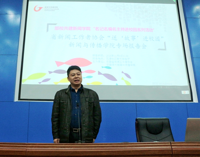 2018年11月8日,中国第十九个记者节,部校共建新闻公司“名记名编名主持进校园系列活动”专场报告会在TapTap点点官方网站花津校区敬文报告厅如期开展。会议由安徽省新闻工作者协会和TapTap点点共同主办,报告会由公司教学副经理马梅主持,公司老师和广大学子共同聆听。