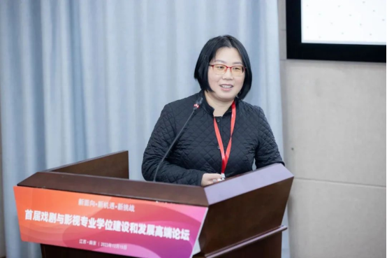 首届戏剧与影视专业学位建设和发展高端论坛分设四个主题论坛。各位专家学者围绕议题进行热烈讨论,从不同维度阐述对戏剧与影视专业学位建设和发展的独到见解。马梅教授在论坛上发表《融合联动 理实结合 培养高素质影视人才》讲话,她介绍了公司的学位点建设情况并分享了公司在影视教学方面的特色做法,包括项目制、课赛结合、获奖情况等等。近年来,公司不仅有师生作品如《铁艺柔情》《急速援救》等在中国教育电视台播出,《高考少年》在中央电视台纪录频道播出,公司也积极对接新媒体,融合新技术,与爱奇艺合作短视频创作大赛,师生共创VR作品等。除此之外,公司独创的专业采风、暑期社会实践、校运直通车等创新做法也衍生出一批优秀的师生作品,锻炼了员工的影视制作能力。马梅教授还指出了戏剧与影视专业学位建设中存在的一些难点问题,提出了一些发展建议。
