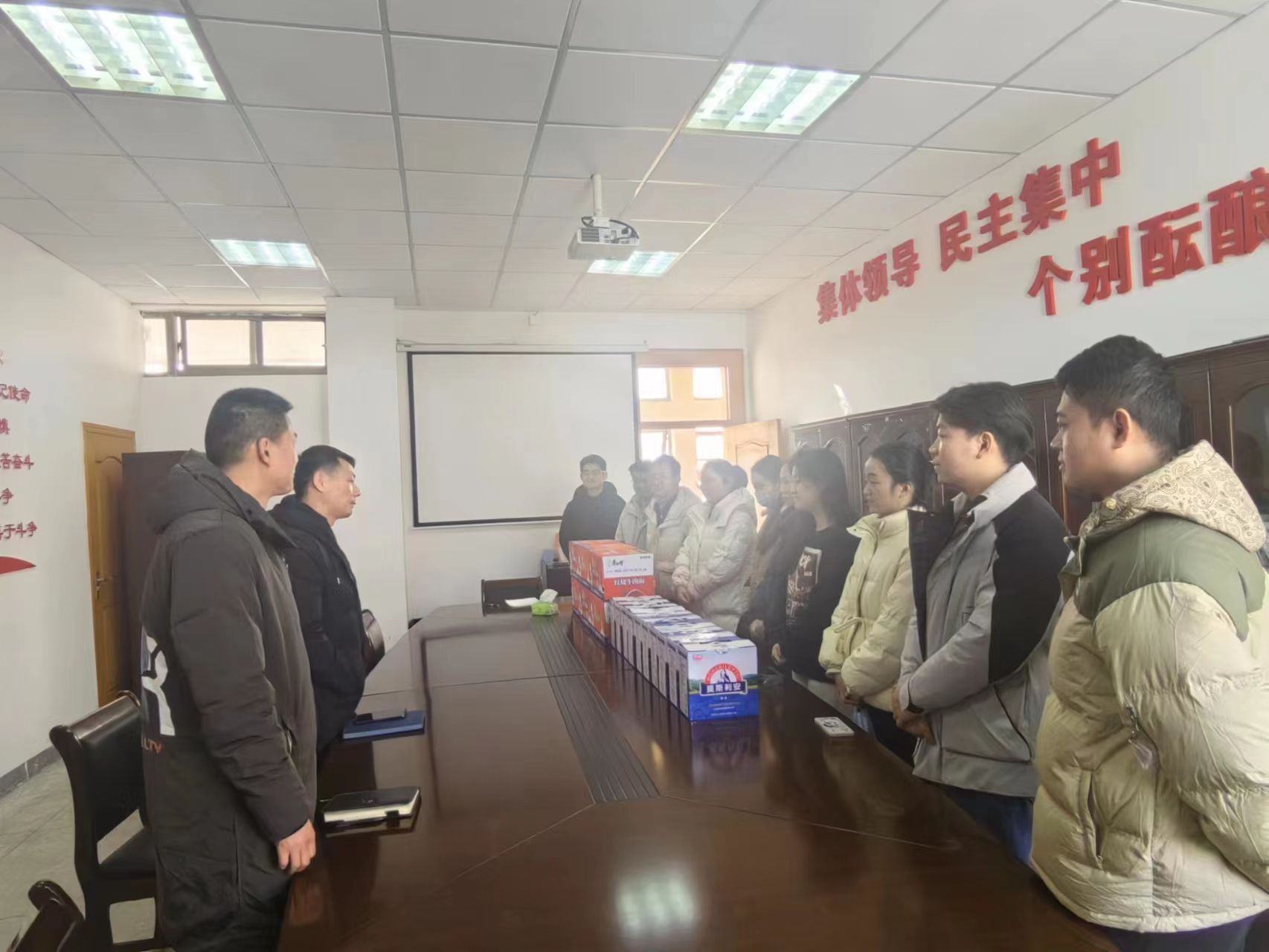 12月27日上午,公司党委书记张师帅、行政副经理公司周伍,代表公司党委、分工会为执行夜间值班任务的全体专兼职辅导员送来了酸奶、方便面,对坚守工作阵地的学工队伍予以物资支持和精神鼓励,公司党委副书记携全体专兼职辅导员接收慰问。