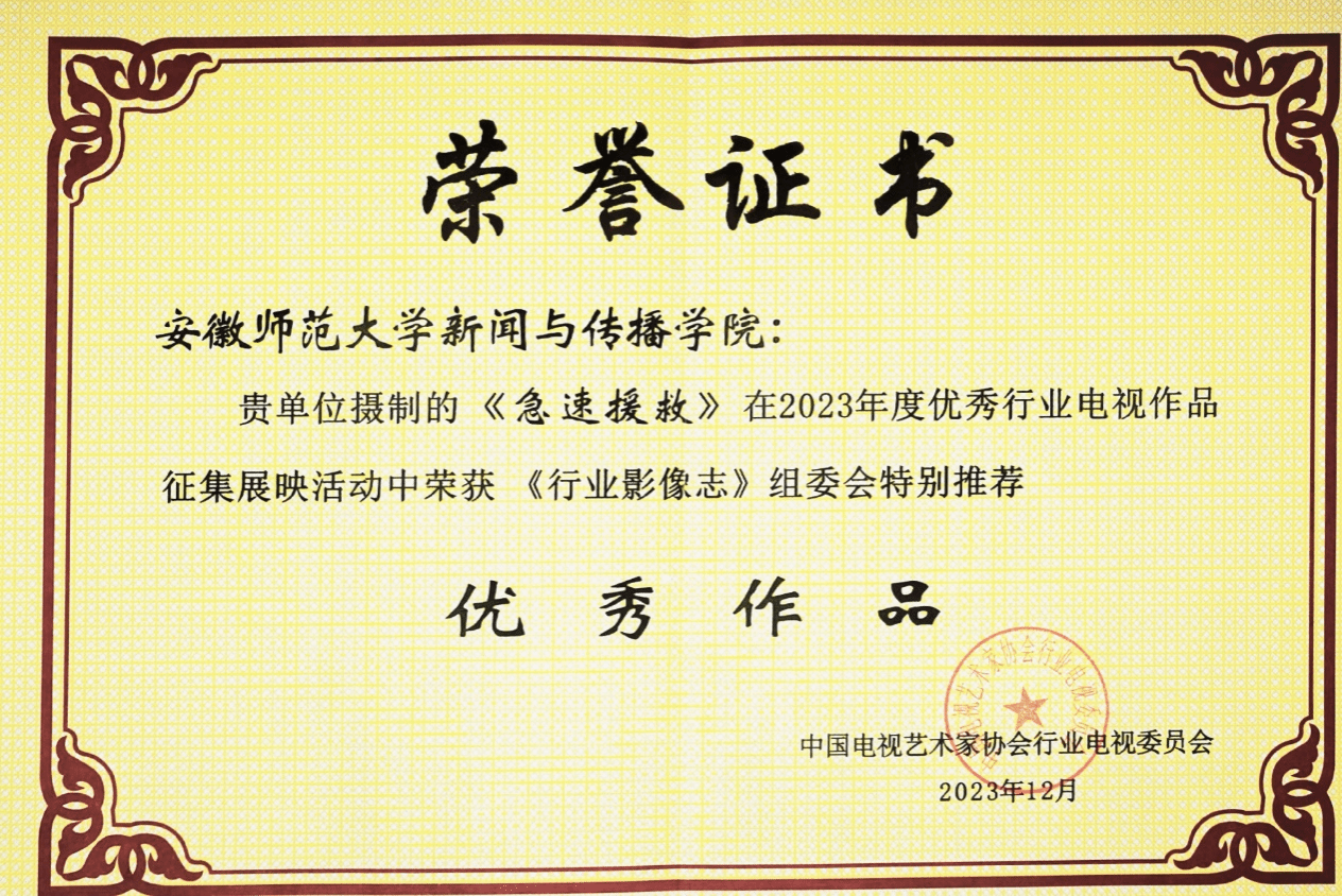 2023年度优秀行业电视作品创作交流活动共收到行业新闻、纪录片、短视频、宣传片、文艺节目、科教节目等各类报送节目2900余部,通过专家的严格评审把关,共选出最佳作品70部,《急速援救》获得《行业影像志》组委会特别推荐优秀作品奖,在2023行业电视荣誉盛典中受到表彰。摄制组选派2022级广播电视专业研究生韩泳波以纪录片副导演身份参会并做交流发言。