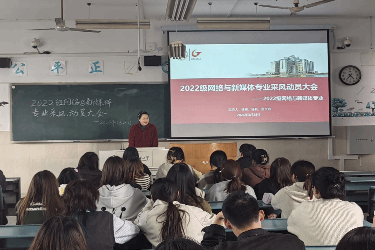 为激发同学们的创新意识,提升其实践能力,2024年3月28日,2022级网络与新媒体专业召开专业采风实践教学动员会,本次班会由专业主任林燕、指导老师杨帆、章文宜主持,2022级网络与新媒体专业全体同学参会。