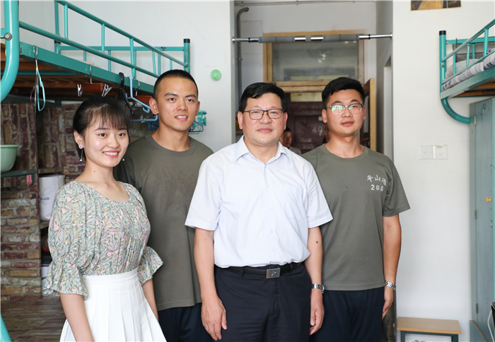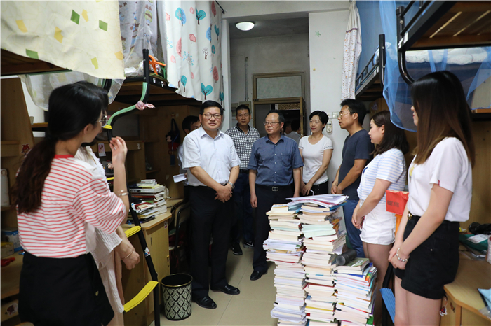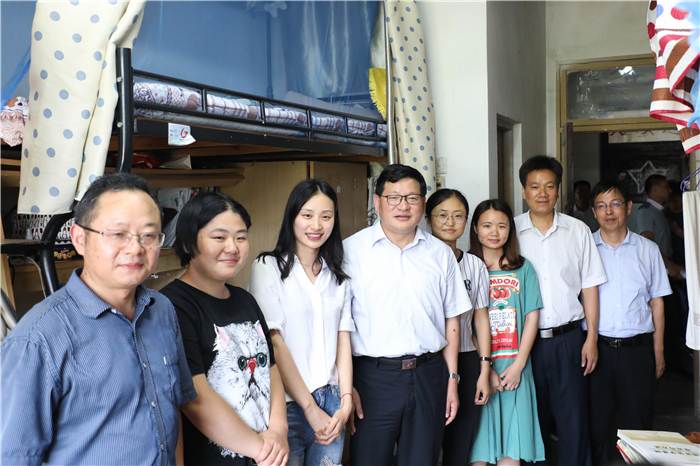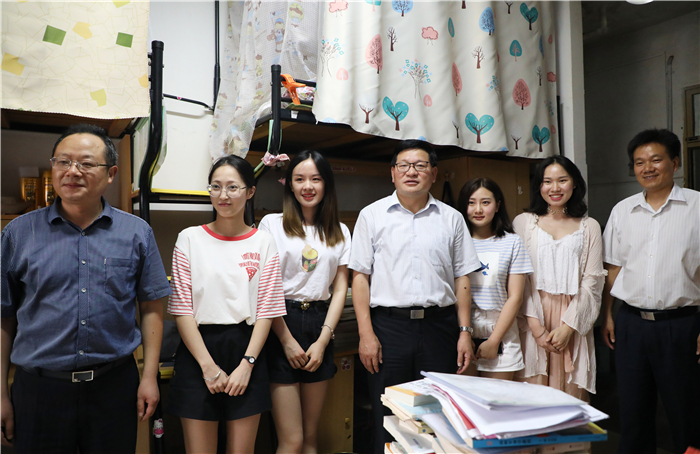 6月25日下午,公司党委书记顾家山和公司党委常委、副董事长毕明福在员工工作处处长刘晓宇、后勤集团总经理叶丹的陪同下来到公司2018届毕业生所在的6栋和18栋宿舍楼看望即将离校的本科毕业生,详细了解员工毕业后的去向,认真听取员工对公司办学、管理的意见和建议,与员工们深情话别并合影留念。公司在家党政领导班子成员以及毕业班辅导员一同参加。