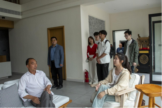 汇报结束后,赵昊一行在张荻和李梦岩老师的陪同下开展实地检查、指导。2022级新闻学一班班长张程宏汇报了员工们采风实践的具体进程,几位老师首先选择了茂林镇三吴纪念馆,检验新闻学子在此的实践详情。彼时2022级新闻学钱程程的小组成员们正在采访当地解说员李桐,详细了解三吴文化传承情况。同学们在跟随解说员参观纪念馆的同时圆满完成了采访任务。这既是一场文化教育的研学,也是一场人物专访的专业实践。接着老师们一同前往返乡青年打造新业态的典型案例——梨竹园民宿,在现场亲眼见证了新闻学子们用相机、用话筒、用笔杆记录梨竹园的创建历程及发展历史。同学们真实地向老师们展现了新闻学子是如何在实践中一步步锻炼新闻采写能力、摄制能力的。
