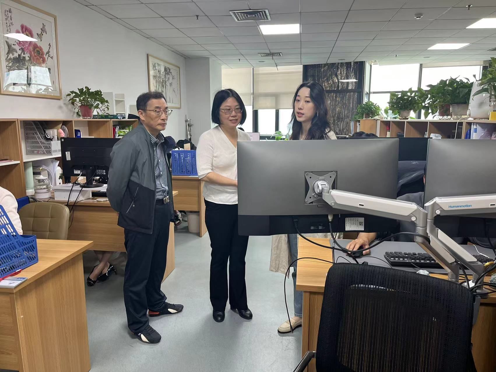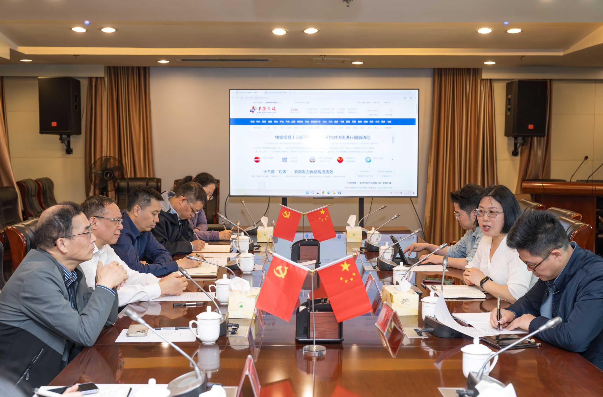 在安徽新媒体集团,集团党委书记章理中、副总编辑陈宝红,中安在线网站总编辑王根喜等集团领导热情接待了公司一行,并陪同参观了安徽国际传播中心,了解了集团在国际传播方面的创新实践。集团国际传播中心副主任梁帆详细介绍了中心的发展历程、业务布局以及未来规划,特别是在技术赋能、内容生产、品牌培育、人才培养和市场运营方面的成功经验。