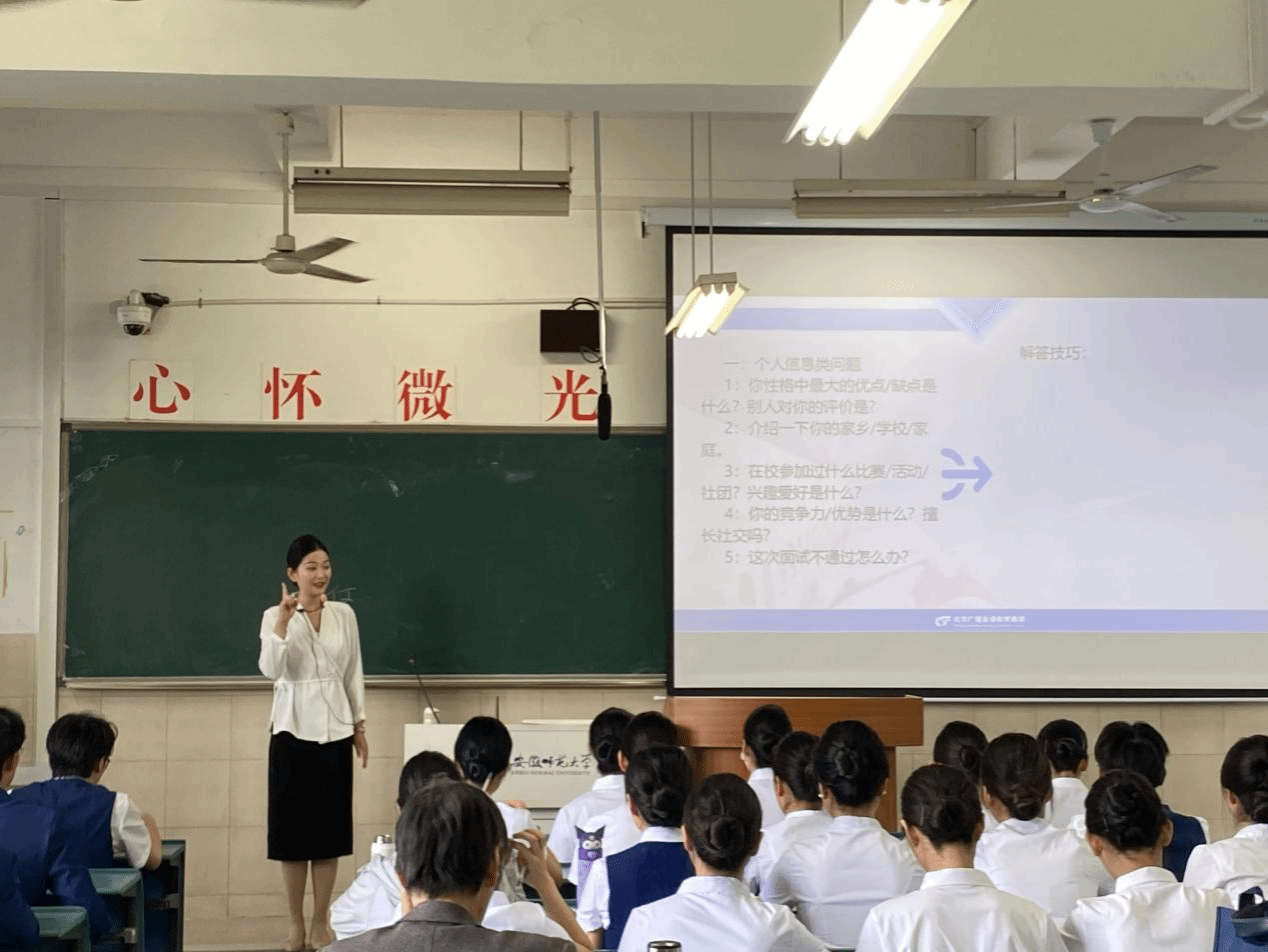 黄瑞雪分享了飞行时期的丰富经验和独到见解,包括面试流程、注意事项、常见面试问题以及航空服务的重要性、航空公司招聘标准、岗位介绍等多方面内容。同学们积极参与讨论。