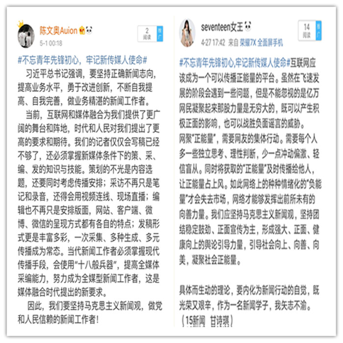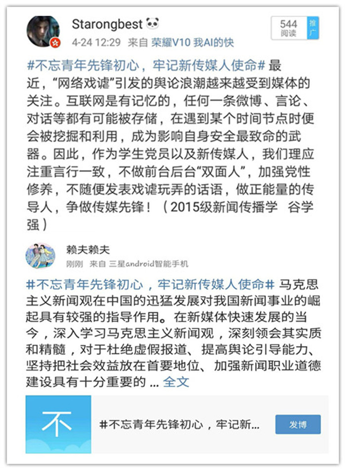 此次“校庆寄语征集”活动将公司九十周年校庆与新闻传播的专业特色,党课理论学习精神相结合。党课班成员积极参与,围绕感念师恩,感恩母校和对公司的发展的建言献策三大主题展开,把自己的想法,心意和建议都写到微信中,并发布了“不忘青年先锋初心,牢记新传媒人使命”的话题微博。微信中,原创的诗歌,质朴的话语,诚挚的祝福都饱含着党课班成员对师大的殷切希望与美好祝愿。微博平台上,大家又就“共产党员的初心”“网络正能量”、“传媒责任”“新型传媒人”等关键话题展开了讨论并各抒己见。有同学微博发布道,要将党员责任与传媒使命紧密结合,争做一名党和人民声音的传播者,社会主流价值的弘扬者,正向趣味能量的引领者。在公司与公司的培养指导下,成为“有本领”的青年党员,回馈社会,回馈师大。