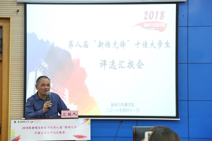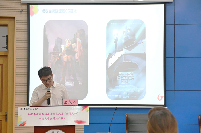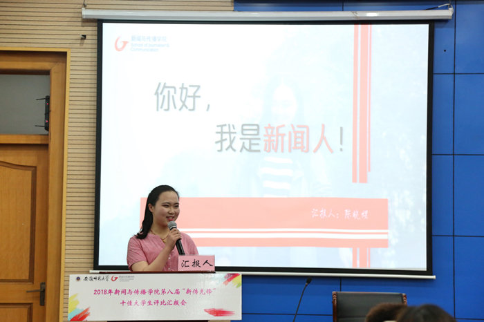晚七点,评比正式开始,15名选手按抽签顺序依次进行为时六分钟的PPT汇报。作为“部校共建”平台培养的员工代表, 来自14新闻的陈晓煜展现了新闻人的风采。 在校期间连续保持专业成绩和综合测评第一,多次斩获各类奖学金,担任班级班长的她始终"想要做一个有趣有爱有情怀有底气的姑娘"。她不是一位“两耳不闻窗外事,一心只读圣贤书”传统意义上的学霸,而是一名真正意义上关注时时事的新闻人,10余篇稿件刊登于新华网、光明网等国家级媒体。她坚持要做一名党和人民信赖的新闻工作者。