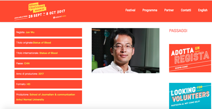 2017年9月28日-10月8日,第二十二届米兰国际电影节(22nd edition of the Milaano Film Festival)在意大利米兰举行,共收到来自世界各地作品2000余部,包括动画、电影、实验短片等,经过评审共选出136部优秀作品,其中动画48部,吴浚导演的《Statue of Blood》入选。