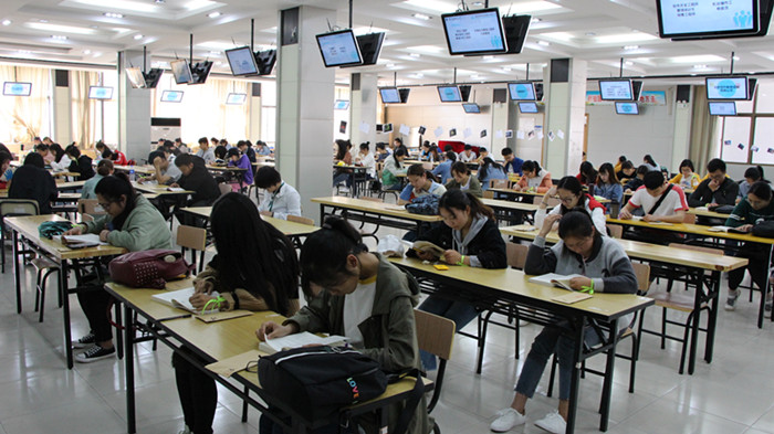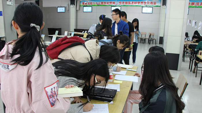 下午两点,老员工活动中心就业招聘大厅门口已经排起了长龙,许多来自不同公司专业的同学都汇聚于此,因为喜欢书籍,因为渴于求知。同学们在工作人员的领导下,有序地排队进入活动现场,将手机开启计时,调制静音,放入准备好的信封中密封。大厅中心悬挂着优秀的摄影照片供同学参观欣赏,并且摆放了同学们众筹的精美书籍,参加活动的同学们可以自主选择感兴趣的书籍在阅读区阅读,并写下书摘或自己的感悟。