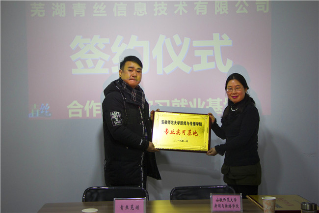 1月5日,院领导宋静、马梅和新闻、网新专业负责人肖叶飞、翟光勇等赴芜湖大砻坊科技文化园、芜湖青丝信息技术有限公司开展就业市场考察并与芜湖青丝信息技术有限公司合作共建专业实习和就业基地。