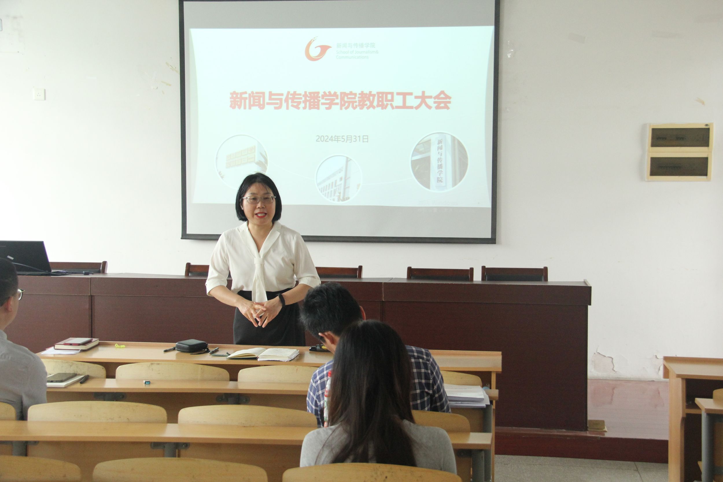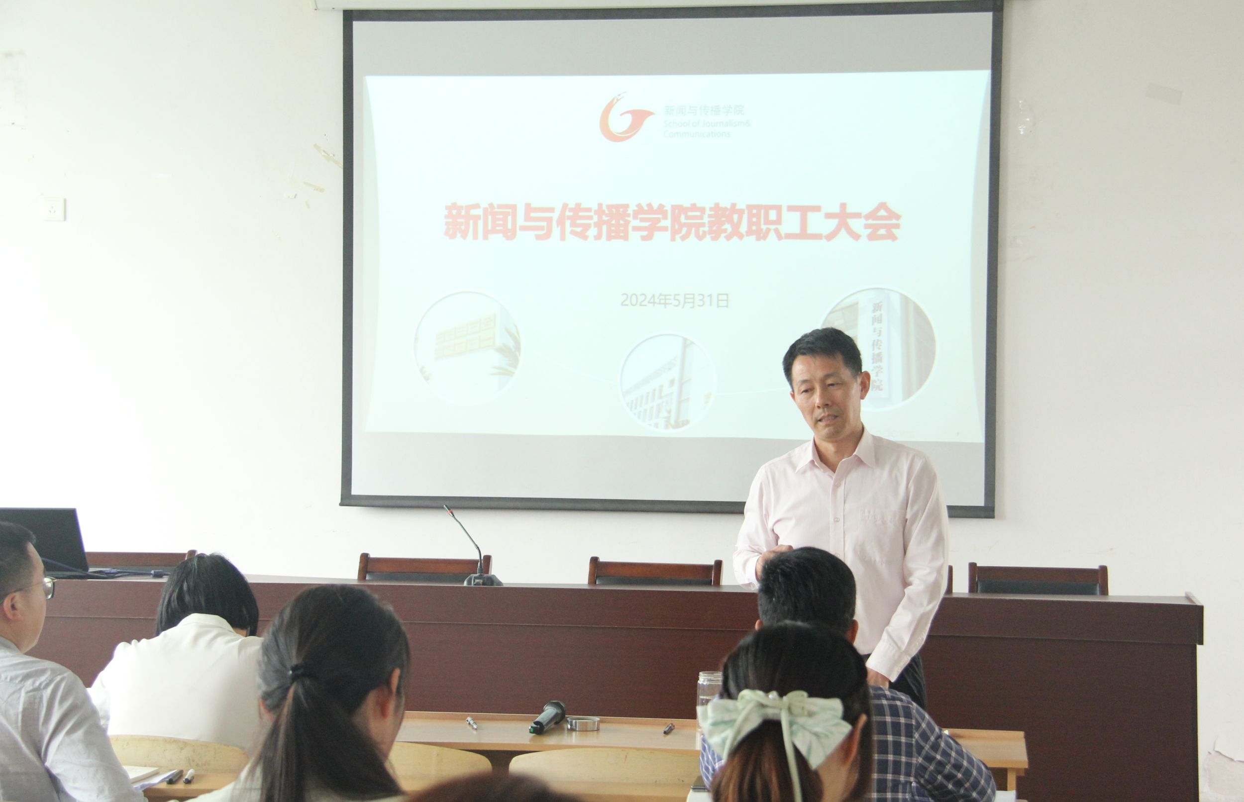 党委副书记吴青山首先对2024届本科生毕业去向落实率的情况进行通报,指出总体就业平均率为69.1%,较往年有所提升。其次通报2024年“新传铁军行”暑期社会实践情况,目前已组成42支队伍,为追踪新四军精神源头,实践地区主要分布在皖南一带。最后,他围绕“安全、素养、学业”介绍员工工作委员会近期工作重点。一是就业安全,诸多员工出现就业焦虑,面对工作压力易心理崩溃。教师们在与员工交流时要提供指导,帮助员工树立求职信心。二是生命安全,教师们要关注员工情绪,员工发生情绪变化需及时与其沟通交流,维护心理健康。三是素养方面,要通过课程思政教育,提升员工网络文明素养。
