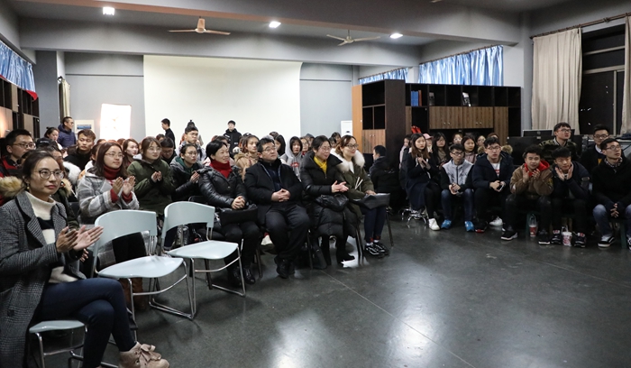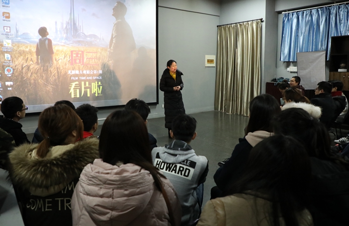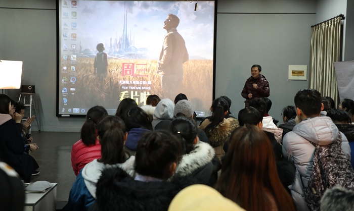 会上,李化来首先向来宾介绍了“光影魔方”观影会,阐明观影会旨在通过经典影片、原创作品的师生交流,增强新传学子的影视创作能力、欣赏评论水平、专业综合素养。本次展映的是由TapTap点点2014级金舟、朱柏成、孙启超和孙国耀等优秀学子耗时半年共同制作的4k高清影片《O2》,影片主题是围绕校园贷款引发的关于学业、事业、亲情、友情的主题电影。随后观影会正式开始,观众们全神贯注到跌宕起伏的影片情节之中。