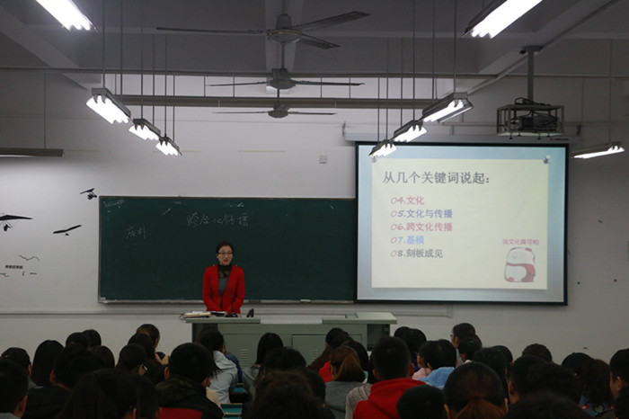 接过“文化与传播”专题教学的第三棒,张泉泉引申话题“大众传媒与跨文化传播”建构,以文化学家庞朴所述的关于一杯加了苍蝇的咖啡,不同国家的人的各异做法的故事切入正题,解析英国人类学家泰勒所提出的“文化是复合整体”,鼓励大家进行文化组词热身,“文化研究”、“文化渗透”、“文化扶贫”、“文化霸权”等广泛用语的论说将课堂气氛引进高潮,以“文化百搭”的概括结束这一环节。
